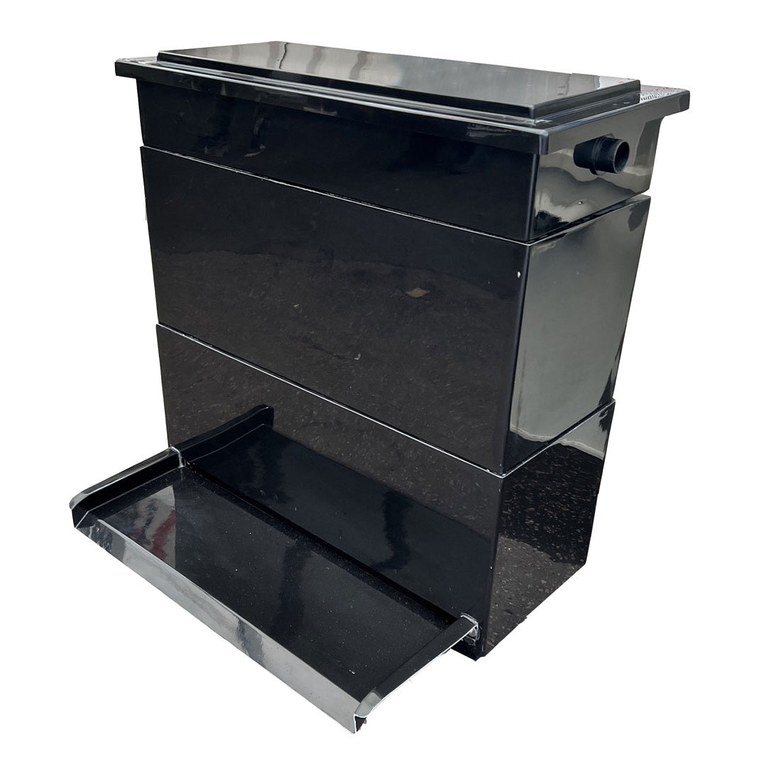 The recommended flow rate to the system is 20,000lph, and the water outlet is through a weir?at the bottom, so this needs to be situation at the pond edge to return the water.