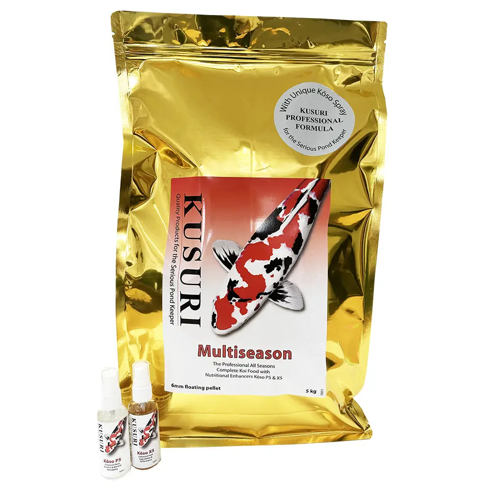 KUSURI Multiseason with KÃ??so P & X, the ultimate food choice for the serious Koi keeper for varying temperatures. High nutrient conversion with multiple additional benefits for optimum Koi health, growth, colour and environment performance all year round. Scientifically researched the combination of this complete feed when used in conjunction with the unique P & X sprays, enhances nutrient digestibility bringing newly discovered microbiome diversity and efficiency assets. See icons for some of the many advantages.