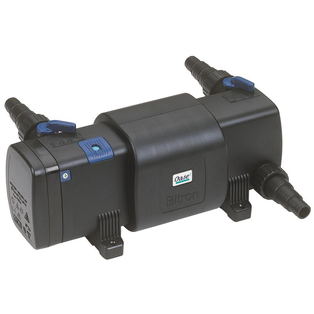 The OASE Bitron C 24 W UVC clarifier removes floating algae and reduces harmful bacteria for healthy and clear water.?An automatic cleaning system ensures fully effective UVC radiation at all times.?A control window provides additional functional reliability.?Eye protection guaranteed by 100%, VDE-tested safety.?With a power consumption of only 24 watts, 3,500 l / h can flow past the UVC tube without a bypass.?The flow can be individually adjusted and regulated.?The OASE Bitron C 24 W UVC clarifier is available complete with a universal stepped hose nozzle from 1 “(25 mm) to 1 ?” (38 mm).?The cable is 5 m long.?A flow nozzle optimizes the flow to the cleaning rotor.?The nominal voltage is 230 V / 50 Hz. Optimal for connection to BioSmart 18000/36000.