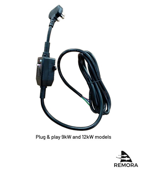 Factory fitted mains cable on 9kW and 12kW plugs directly into 13A outside socket