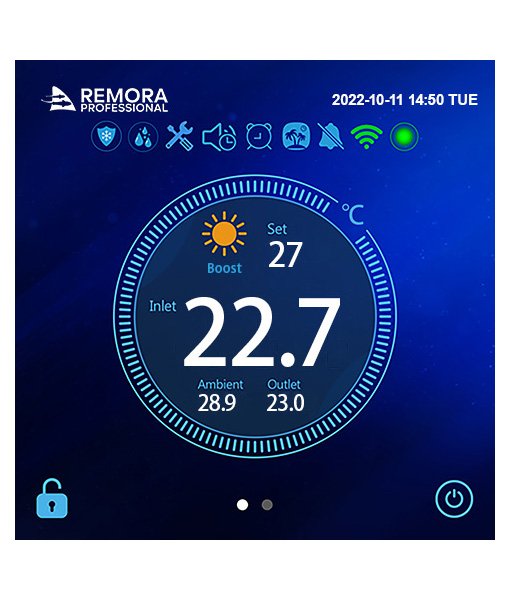 Matching the Remora Professional??s performance, are the highest levels of British quality control and engineering, the powder coated steel case features a cut out fan grill adding to the already sleek and stylish design, the patented, flush fit touch control LCD screen is fully waterproof and requires no additional cover, the full colour display offers precise digital read outs and the heat pump is controllable via Wi-Fi using Smart Life App.