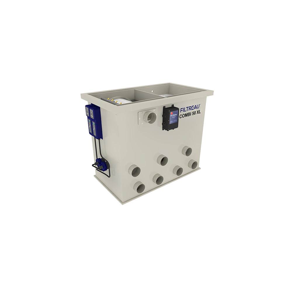 At SKS Wholesale, we understand the importance of maintaining optimal water quality in your pond. The Filtreau Combi XL50 combines the power of a completely automated drum filter and a moving bed/bio-chamber, making it suitable for (koi) ponds of up to an impressive 80,000 L capacity. With this advanced system, you can enjoy the benefits of a clean and thriving aquatic environment.