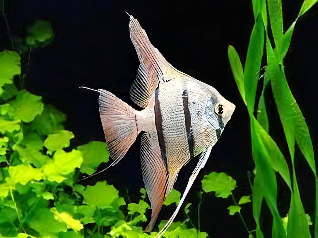 The Angelfish will thrive in a heavily planted aquarium with driftwood and/or rock formations and gentle water flow. It is not overly reclusive, but this fish strongly prefers the cover of plants and, due to its body shape, is not likely to seek refuge in rock caves and similar structures. The Angelfish is generally compatible with other peaceful fish as long as it has plenty of space. Territoriality is typically at its peak during spawning.  Dwarf shrimp and other small, delicate invertebrates should not be kept with the Angelfish, but more durable, larger shrimp and snails could possibly make good tankmates in a large enough aquarium. If spawning is desired, tankmates of other species should be kept to a minimum or avoided altogether unless the aquarium is very spacious.