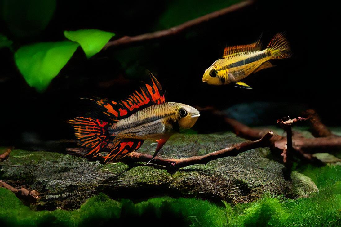 The Apistogramma will thrive in an aquarium with a sandy substrate and plenty of refuge such as clay pots, driftwood, and rock formations. It is an excellent candidate for the planted aquarium, but it also needs a fair amount of open space. This cichlid is generally compatible with other peaceful fish as long as it has plenty of space. Territoriality is typically at its peak during spawning. Dwarf shrimp and other small, delicate invertebrates should not be kept with the Apistogramma Dwarf Cichlid, but more durable, larger shrimp and snails COULD possibly make good tankmates in a large enough aquarium. If spawning is desired, tank mates of other species should be kept to a minimum or avoided altogether.