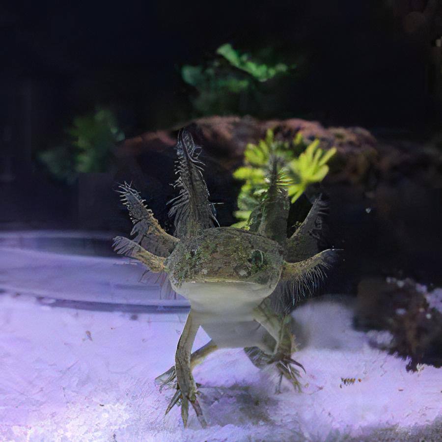 The Axolotl is primarily nocturnal, but will often become active during daytime hours once established in an aquarium with plenty of smooth driftwood, plants, and other hiding places. Its skin is easily damaged, so decor with sharp edges should never be used. It does not require lighting at all, and it will be more outgoing with at least subdued lighting. Floating plants can help with diffusing light. Another crucial aspect of Axolotl housing is the substrate. It will often eat or try to eat anything that will fit in its mouth. No gravels should not be used for this reason, as they can cause impaction of the digestive tract of this species. A good rule of thumb is that the Axolotl will try to eat anything up to the size of its head. Very fine, aquarium-safe sand is a viable option for a more naturalistic-looking Axolotl aquascape, though many Axolotl keepers opt to use no substrate at all. While it does not require a particularly large aquarium for its adult size, the Axolotl does require very clean water and effective filtration with a regular water change regimen.