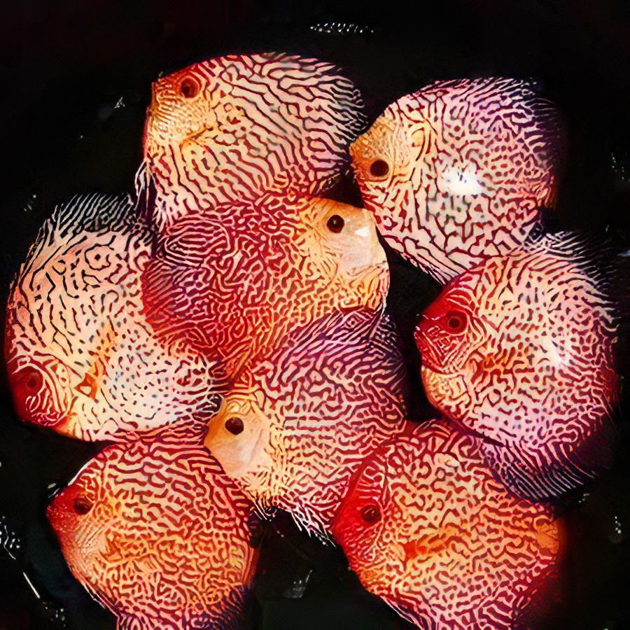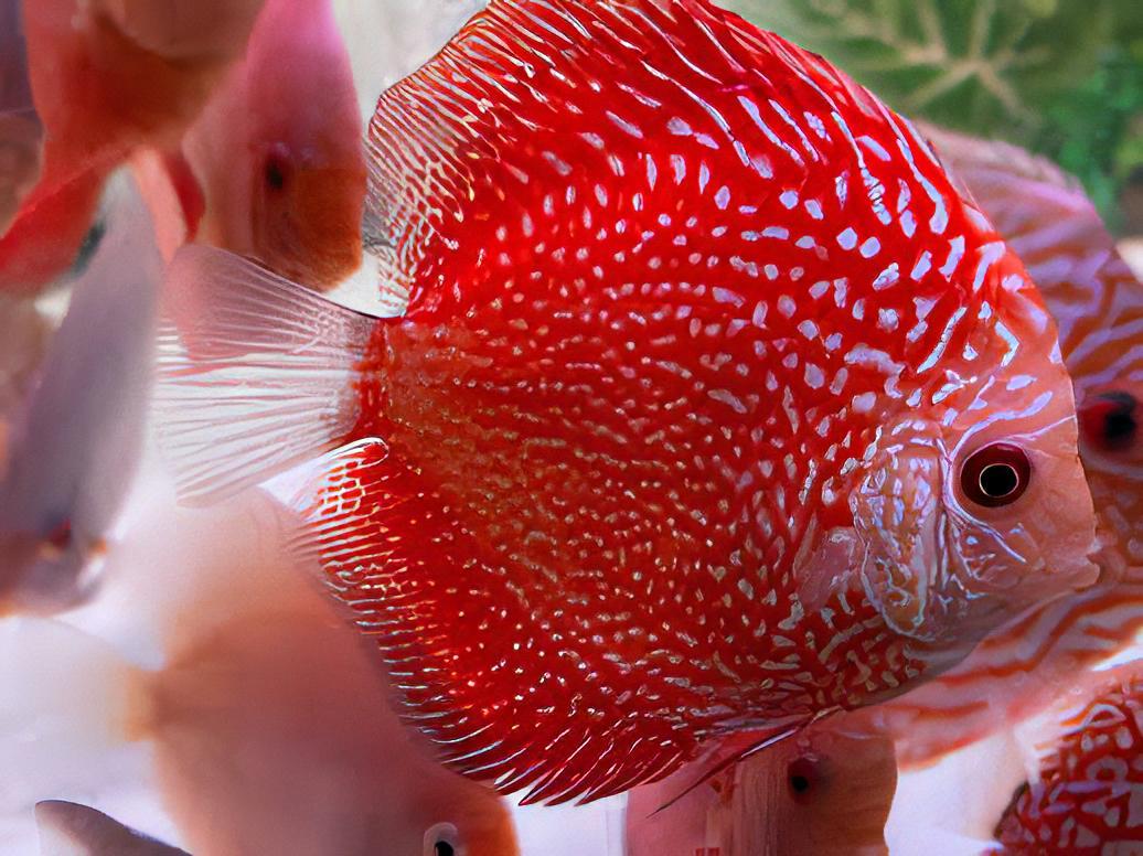 Hailing from the vibrant waters of the Amazon River basin, these breathtaking discus fish captivate enthusiasts with their striking red hues and intricate snakeskin patterns.