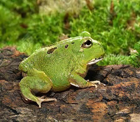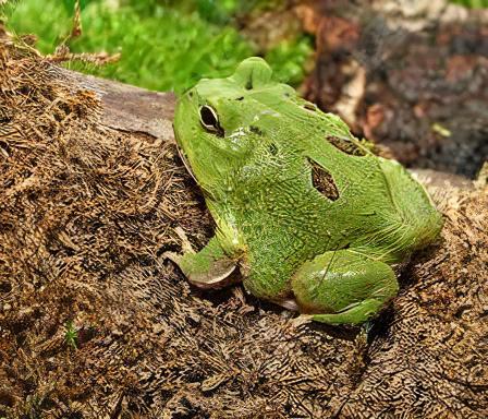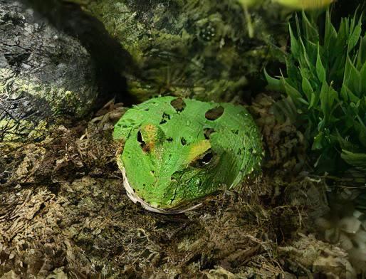 “Meet the Matcha Horned Frog, an exquisite amphibian known for its vibrant green coloration and distinct horn-like protrusions. Originating from the subtropical forests of South America, these unique frogs thrive in semi-aquatic environments.